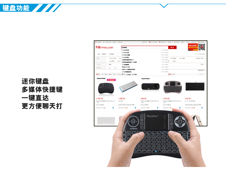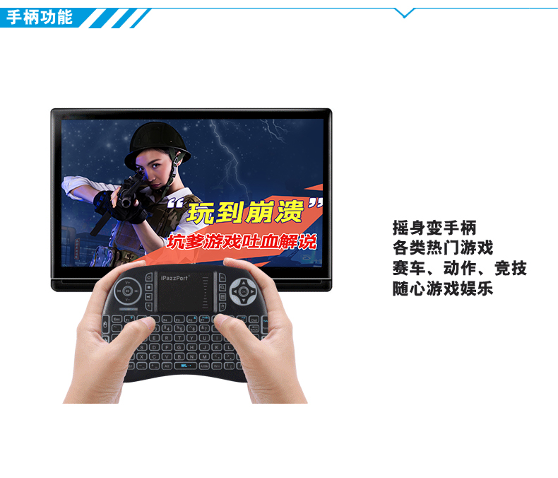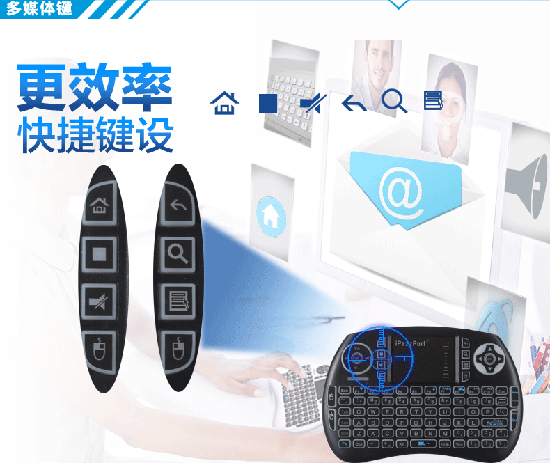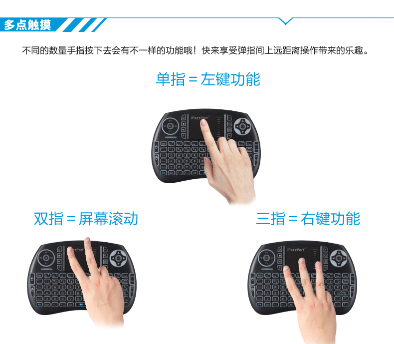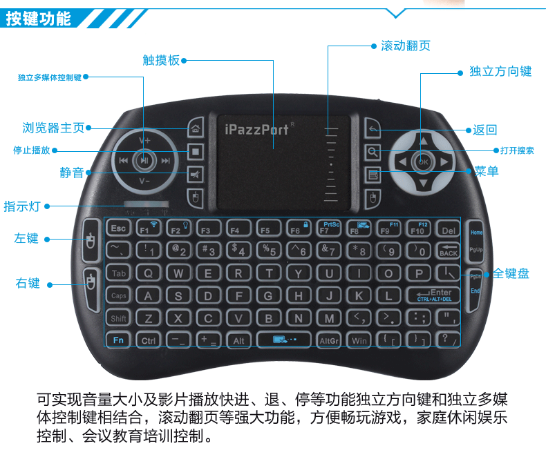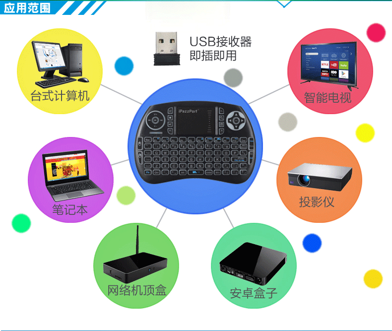 这是一款2 4GHz USB迷你无线QWERTY键盘,带有TouchPad组合,即插即用。 它被用作PC,安卓电视盒,树莓派, 家庭影院 IPTV机顶盒以及其他带有标准USB端口的通用多媒体键盘遥控器。
