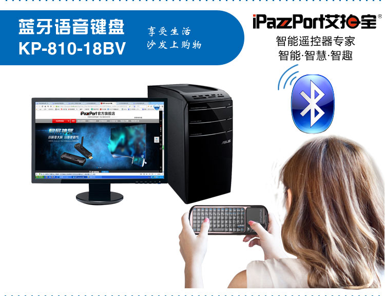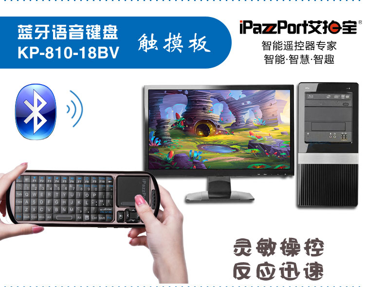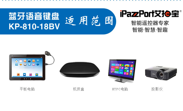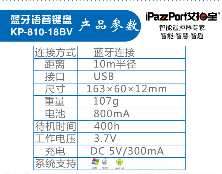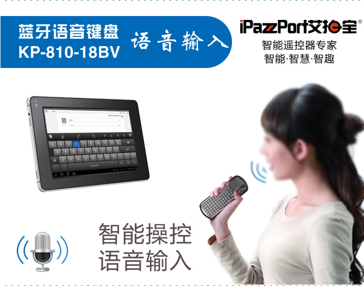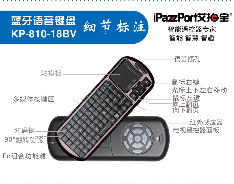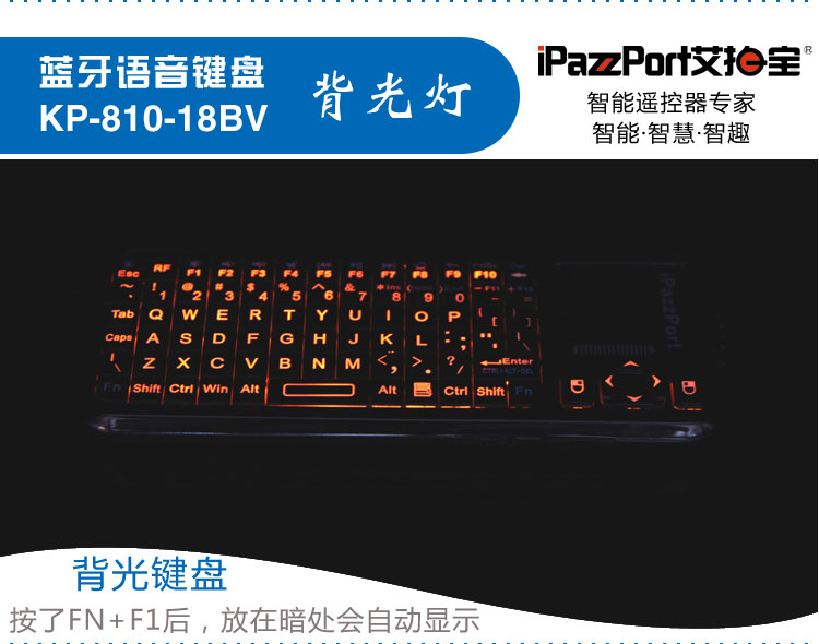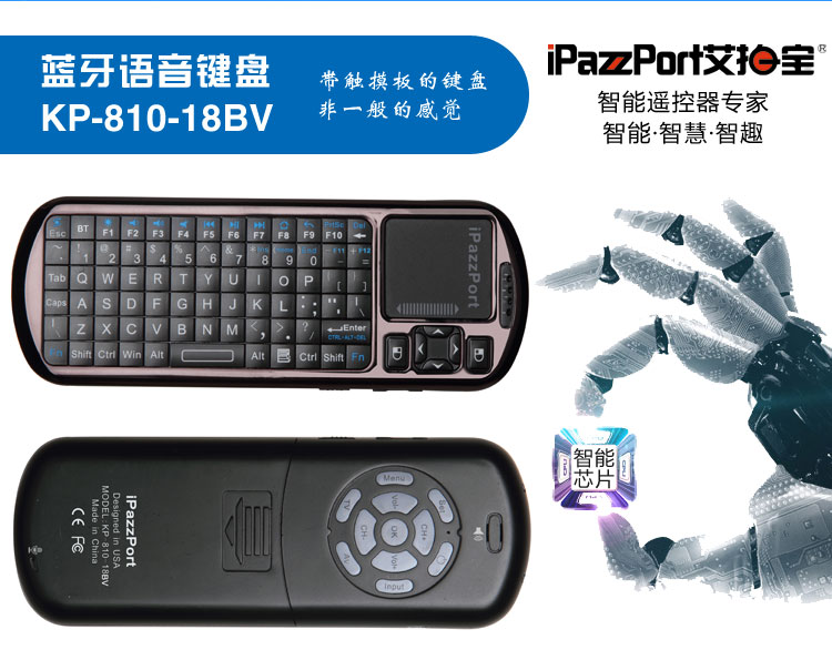 蓝牙语音键盘KP-810-18BV是一款支持语音输入的蓝牙键盘。运用Bluetooth 3 0技术,配备QWERTYW全键盘及触摸板鼠标,集成蓝牙耳机,麦克风,还配有一条耳机线和学习型红外遥控器,在智能手机 平板连接大屏应用功能多姿多彩。