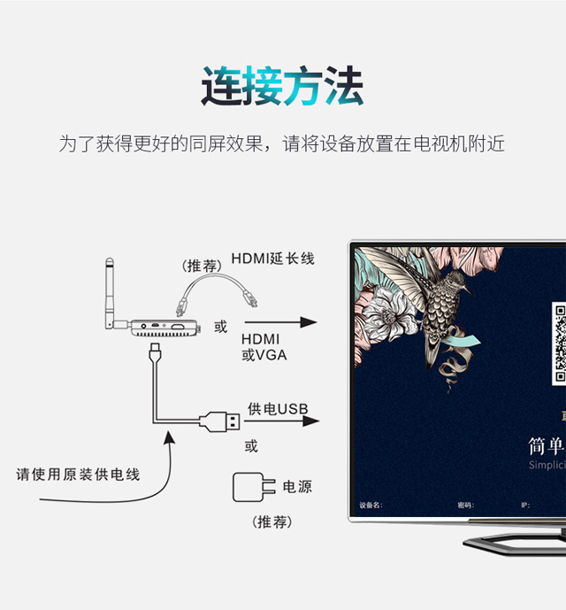 扫码同屏器搭配手机,将手机内容推送到电视或投影上。适用于商务会议、培训教学、公开讲座等。音视频同步传输,画面细腻高清。最关键的是扫码同屏连接上网,简单便捷。以下介绍详细操作步聚!