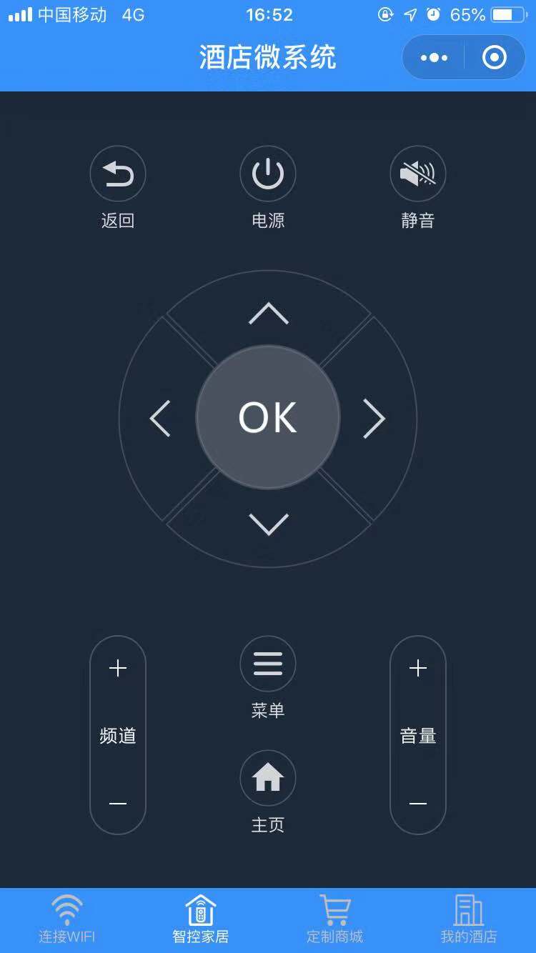2.使用智能手机微信扫一扫电视机开机界面的二维码,跳转到“酒店微系统”界面,手机呈现电视机遥控器菜单。此时可以使用手机对酒店的智能电视机进行遥控操作。