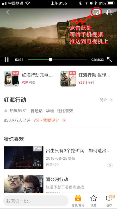 4.打开手机上的在线视频,如:PPTV 、PPS 、优酷、腾讯视频、爱奇艺等等。选择其中一个视频,在播放时点右上角的TV按钮。此时手机视频就可以推送到电视机上播放。在推送视频的过程中,对手机正常功能的使用,并没有任何影响。包括:接打电话、微信聊天等等。