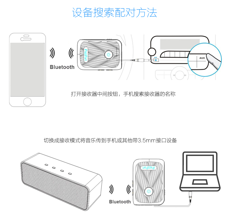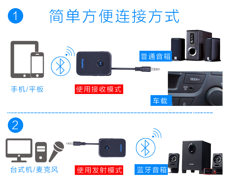 实现家庭里蓝牙产品和非蓝牙产品的自由转换。有了它,家里的非蓝牙音箱就秒变蓝牙功能,无线连接到蓝牙主机(手机,平板上等)实现音频的跨界传输, 将它插到非蓝牙的主机上(如台式电脑), 就可使电脑的音频传输到蓝牙音箱上。