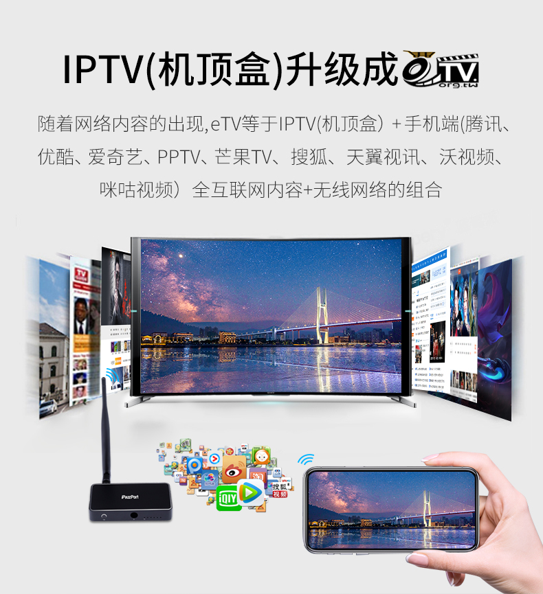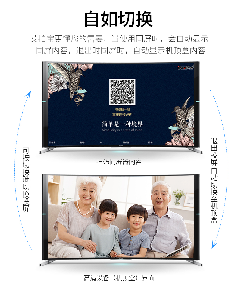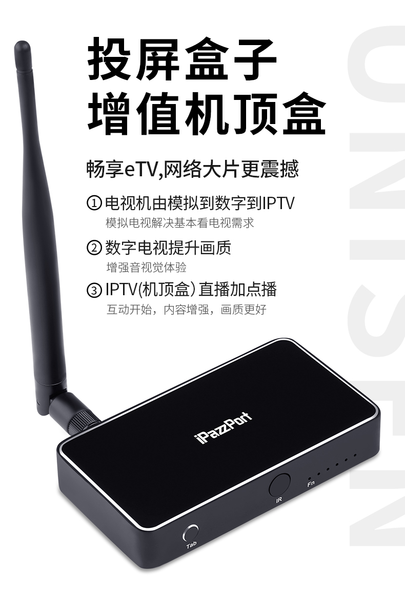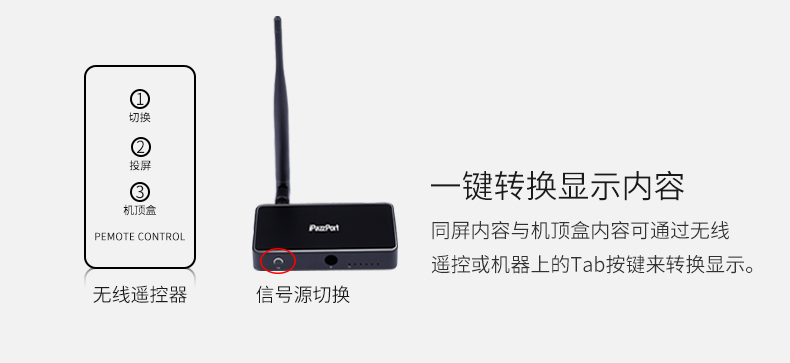 9)HDMI投射和机顶盒之间的自由切换:将机顶盒与此ipazzportcast连接,然后与电视连接,然后您可以通过遥控器(可选项),或者按压投屏器上的切换按钮进行信号源的转换。