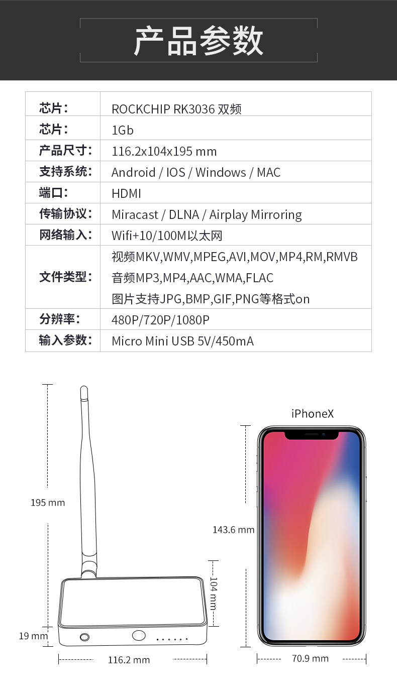 2)支持DLAN,Airplay,Miracast协议; 显示流畅无延迟;